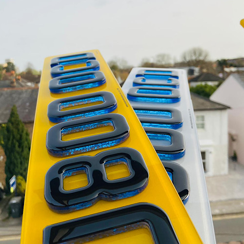 Set of premium 4D gel black neon blue 5mm replacement number plates laser cut to perfection. Manufactured using cutting edge laser technology in house, these are the latest bespoke number plates currently on trend. All characters have been designed to match the current Charles wright font. We use the highest quality letters and digits by using 3mm acrylic characters topped in jet black acrylic. As per the legality all of our plates are complaint with the DVLA standards ensuring they are MOT complaint with each plate marked with Easy Number Plates details and British Standards (BS AU 145d) markings.