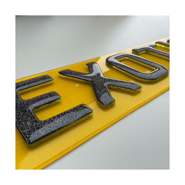 Set of premium 4D Glitter Gel Yellow Replacement Number Plates laser cut to perfection. Manufactured using cutting edge laser technology in house, these are the latest bespoke number plates currently on trend. All characters have been designed to match the current Charles wright font. We use the highest quality letters and digits by using 3mm acrylic characters topped in jet black acrylic. As per the legality all of our plates are complaint with the DVLA standards ensuring they are MOT complaint with each plate marked with Easy Number Plates details and British Standards (BS AU 145d) markings.