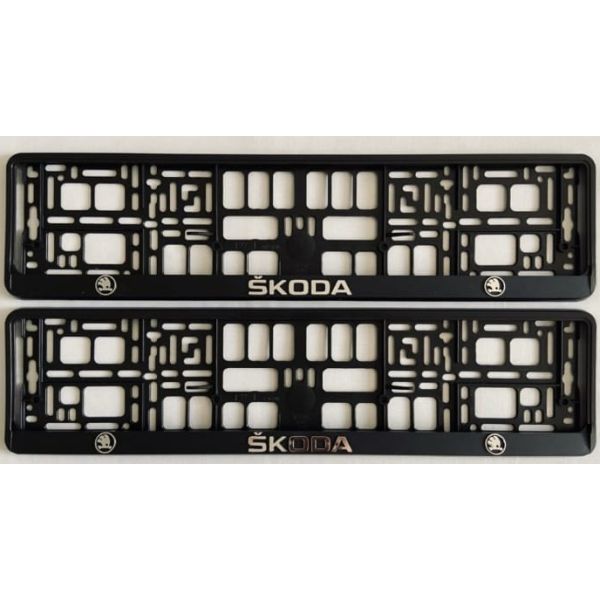 SET OF SKODA NUMBER PLATE HOLDER SURROUNDS. RAISED 3D EMBOSSED FINISHED IN PREMIUM SILVER FOIL. ENHANCE YOUR NUMBER PLATES LOOK WITH A MORE CLEANER, SHARPER FINISH. FRONT AND REAR.